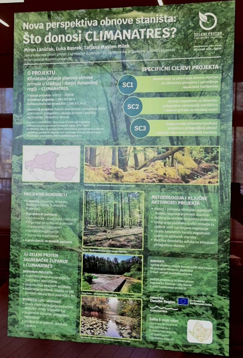 Javna ustanova Zeleni prsten Zagrebačke županije predstavila je na trećoj po redu stručno-znanstvenoj konferenciji „Maksimalno na strani prirode 2026“ postersko izlaganje o projektu CLIMANATRES (Klimatsko jačanje planova obnove prirode u srednjoj i donjoj dunavskoj regiji). Postersko izlaganje pripremili su Miran Lanšćak, Luka Basrek i dr.sc.Tatjana Masten Milek.