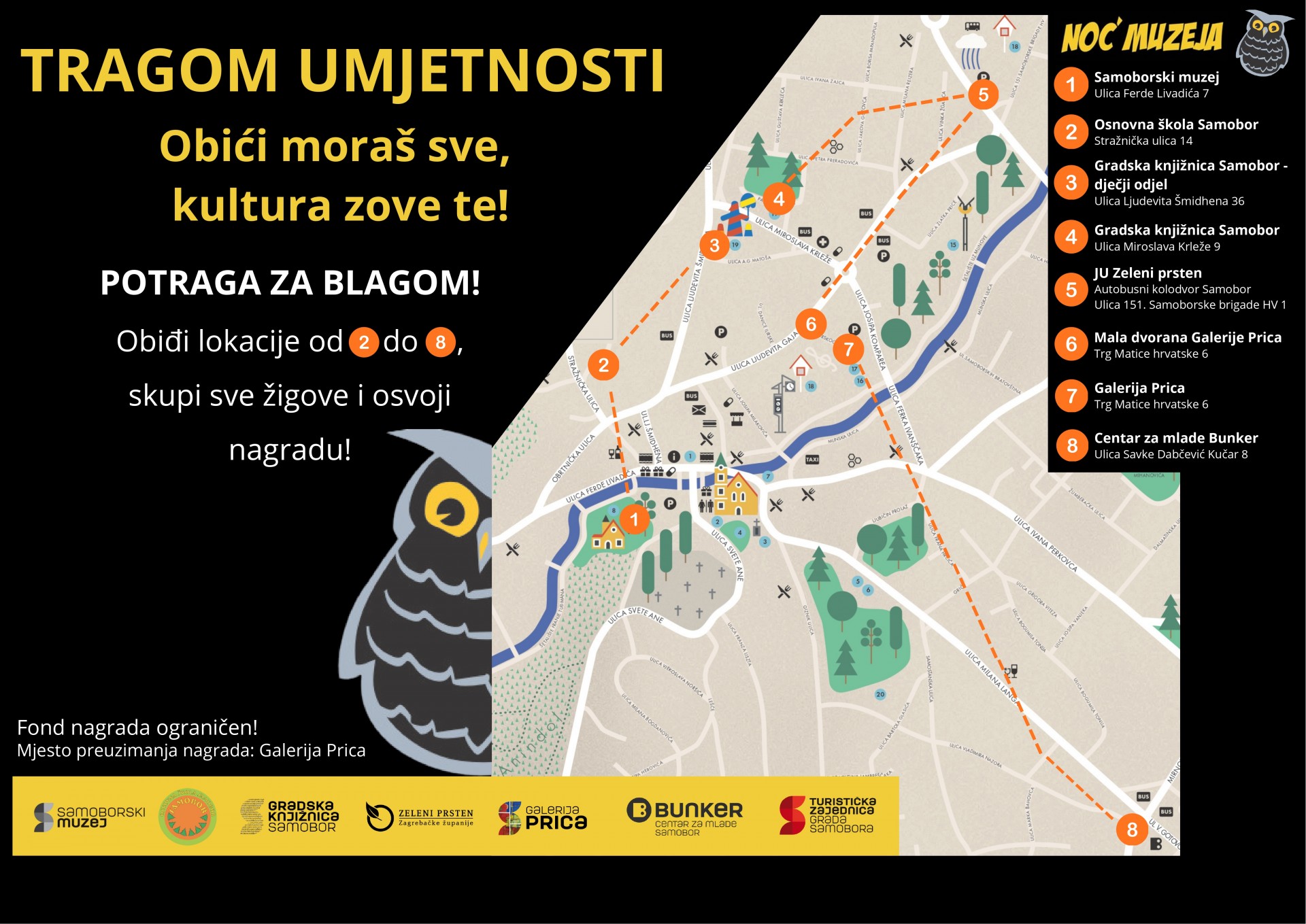 Po prvi put u ovakvom formatu udružili su se: Galerija Prica, Osnovna škola Samobor, Gradska knjižnica Samobor i JU Zeleni prsten Zagrebačke županije uz podršku Turističke zajednice grada Samobora. „Tragom umjetnosti – potraga za blagom“ poziva sve da se uključe, istražuju, uče i uživaju u kulturi na drugačiji način. Za najbrže sudionike koji će kroz kulturu doživjeti Grad, očekuje i simbolična nagrada.