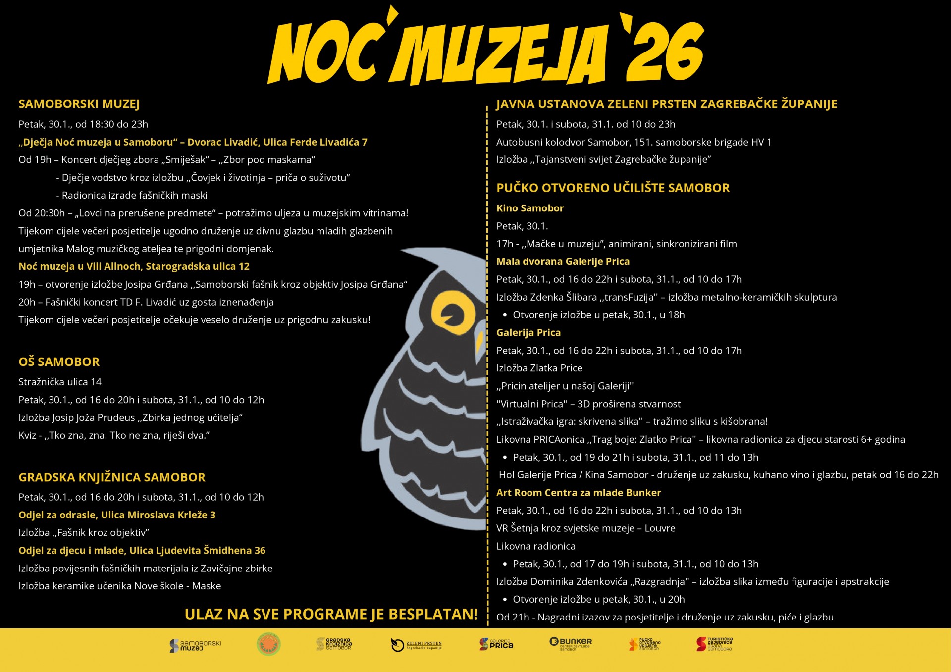 Samobor ovoga siječnja dobiva jedno potpuno novo kulturno iskustvo. Povodom Noći muzeja, u petak i subotu, 30. i 31. siječnja premijerno se predstavlja pilot projekt „Tragom umjetnosti – potraga za blagom“, inovativna kulturna šetnja koja povezuje umjetnost, grad i publiku svih generacija. Riječ je o projektu koji potiče građane da prošeću Samoborom, obiđu muzejske i galerijske izložbene prostore, upoznaju kako se različite ustanove uključuju i aktivno sudjeluju u kulturnom programu, prateći unaprijed osmišljenu rutu i prikupljajući žigove na svakoj lokaciji.
