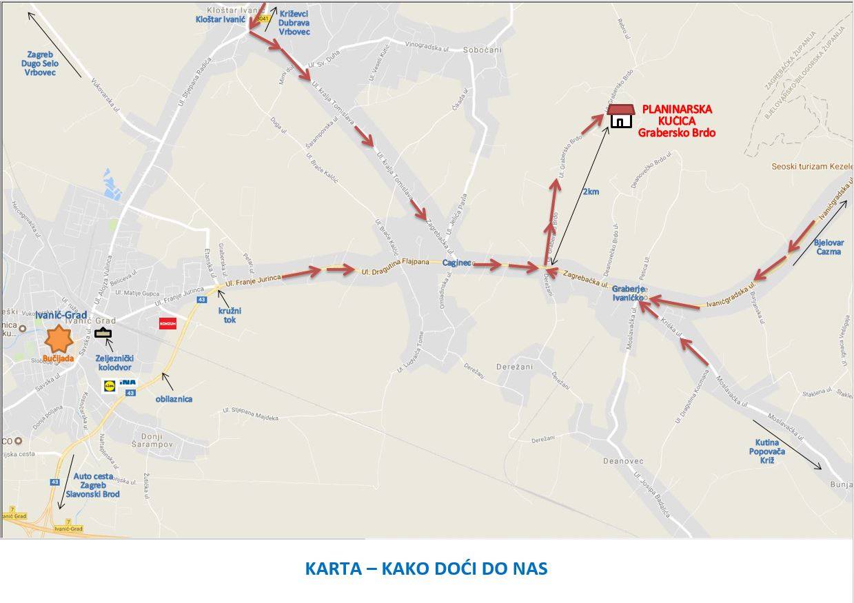 Vlastitim prijevozom: dolazite direktno u Grabersko Brdo iz mjesta Graberje Ivanićko do planinarske kuće, koja se nalazi na 2 kilometra od glavne ceste (D43). Veća prijevozna sredstva (autobusi) će iskrcati putnike kod planinarske kuće te se vraćaju u Graberje Ivanićko ili odlaze za Ivanić-Grad, gdje mogu parkirati. Vozače autobusa, po želji, prevest ćemo do planinarske kuće.